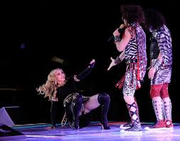 To be honest, I've been concerned about Madonna since the 53 year old's Superbowl appearance. While she did prove Sally Field correct that Boniva can do wonders for your osteoporosis and allow your bones to hold up so you may be flipped about by strapping young men while still managing to lip sync somewhat believably, it also proved that we have entered a new level of crazy and delusion in the constant chameleon that has been this pop star. Her wobbly-kneed moves looked like she was trying to walk and pelvic thrust at the same time but just couldn't quite coordinate it all. And then she added pom pom waving which is just not fitting for a middle aged woman. Some of the most exciting moments in her set that night were when it looked like Madonna was going to go down on the risers and not be able to get back up.